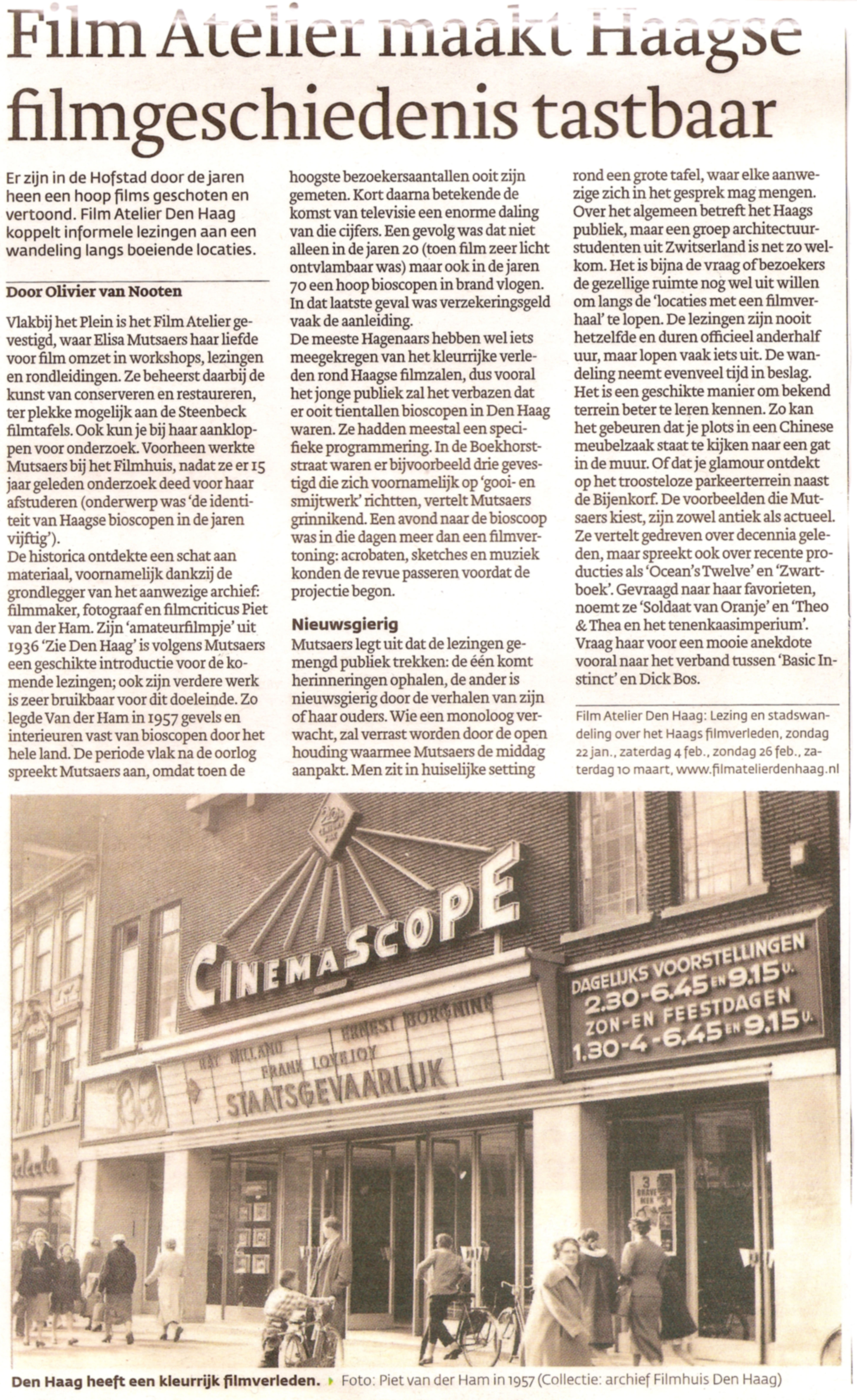 Journalist Olivier van Nooten schreef een artikel over de lezing + wandeling 'Film in Den Haag' dat op vrijdag 20 januari 2012 in Den Haag Centraal verscheen.